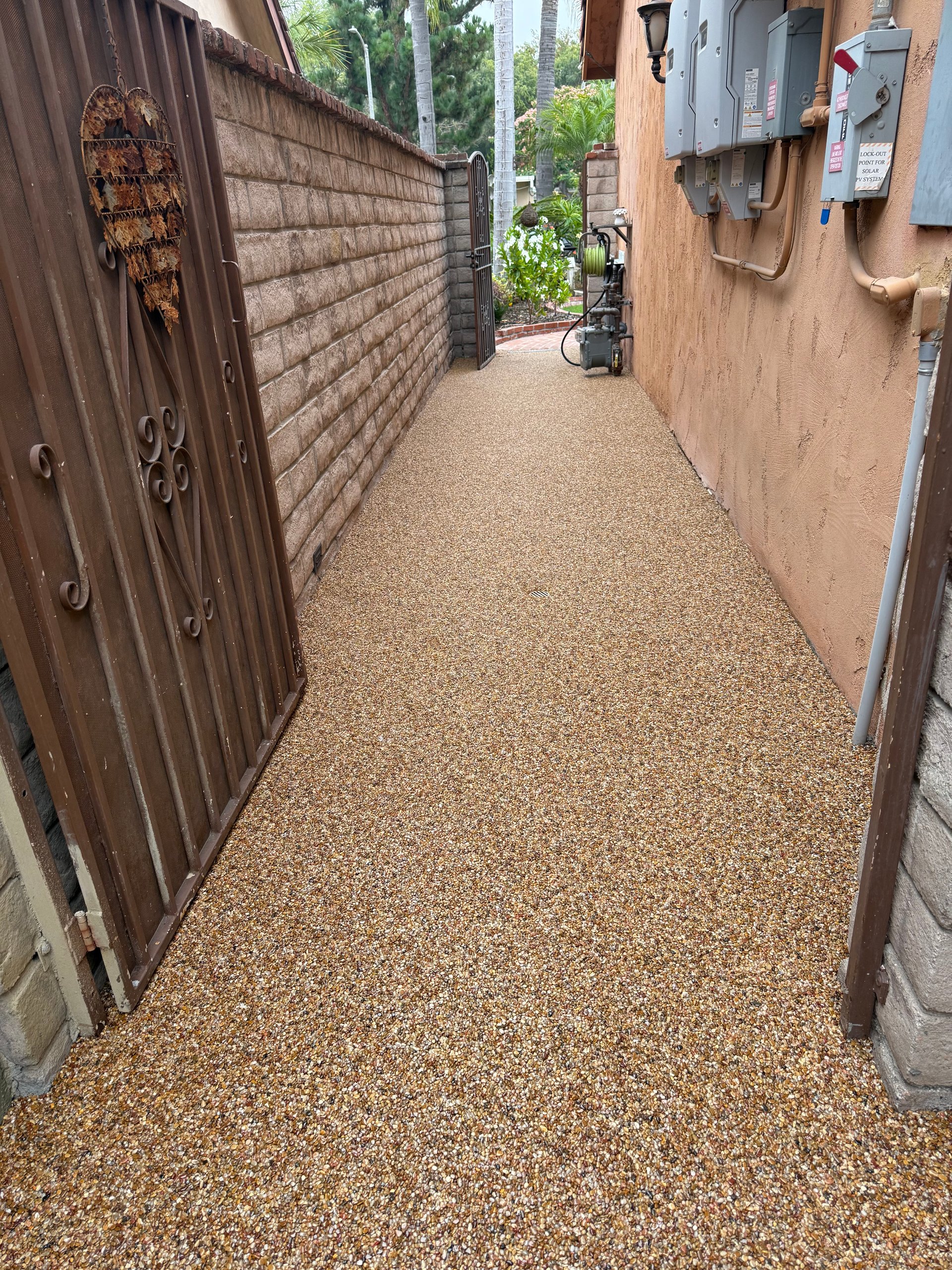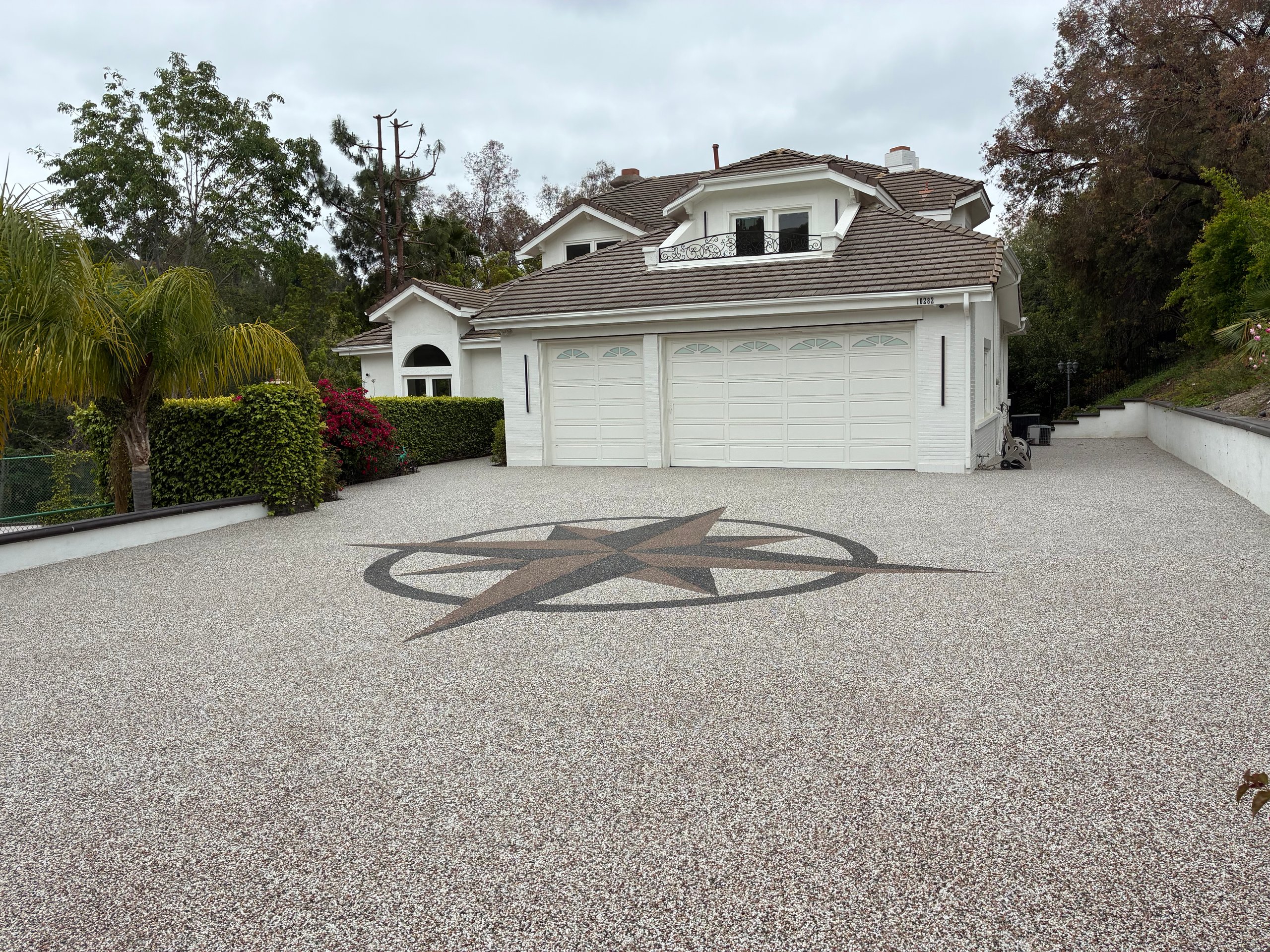 Pebble epoxy overlay fills minor cracks and levels uneven surfaces while creating a cohesive, upscale appearance. The UV-resistant epoxy ensures your driveway won’t yellow or fade under Southern California’s intense sun exposure—a critical advantage in our climate where surfaces endure 300+ days of direct sunlight annually. The permeable surface remains slip-resistant even during rare rain events, and unlike regions with freeze-thaw cycles that cause cracking, our mild winters mean your investment stays intact year-round.